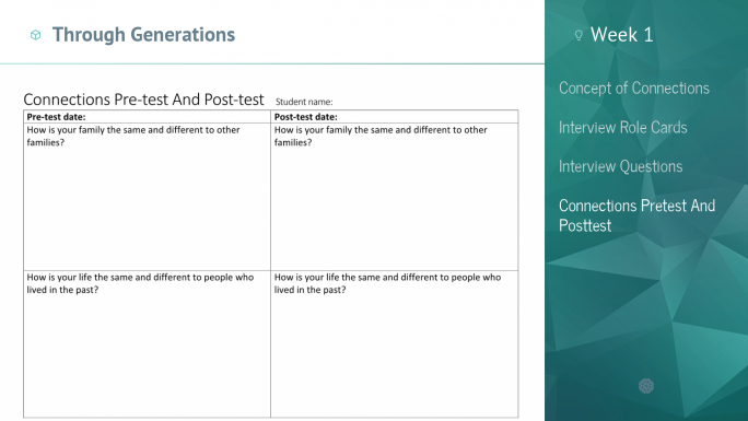 Students will use their knowledge of the lives of people in the past to participate in conversations with their parents and grandparents. They will pose interesting questions and think of follow-up questions. Students will use language to describe events in the past, present, and future and provide reasons for their conclusions. They will develop an interest in different ways that people tell stories and an appreciation of the importance of place to different cultures.